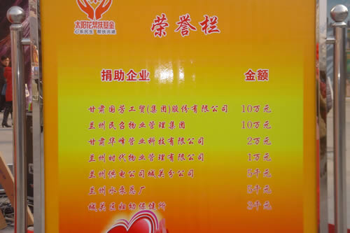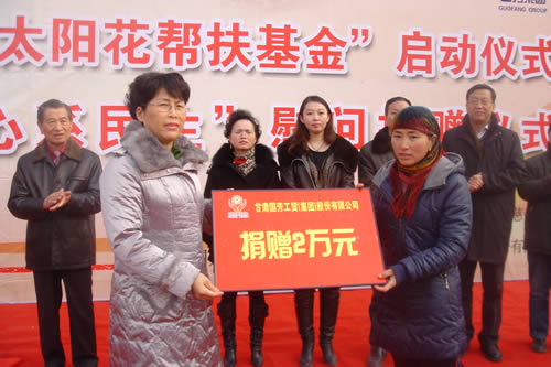 2012元月6日下午3時,甘肅國芳集團聯(lián)合城關(guān)區(qū)皋蘭路街道黨工委、辦事處舉行了“創(chuàng)先爭優(yōu)、扶貧濟困”太陽花幫扶基金啟動儀式,充分體現(xiàn)民生為本的服務宗旨,著力搭建社會幫扶救助平臺,切實解決弱勢群體實際困難,促進和諧街道建設。