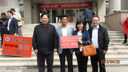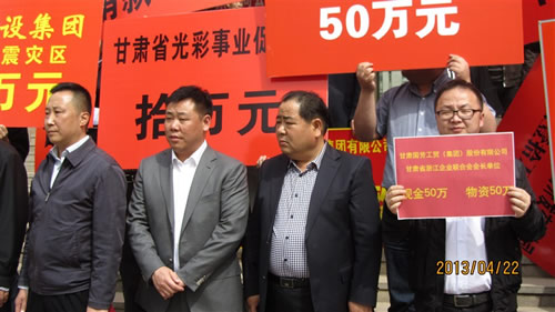 2013年4月22日下午15時,在甘肅省政協(xié)一樓,由甘肅省委常委、省委統(tǒng)戰(zhàn)部部長澤巴足,省委統(tǒng)戰(zhàn)部副部長、甘肅省工商聯(lián)黨組書記、第一副主席吳繼德等相關(guān)領(lǐng)導(dǎo)出席了“甘肅省商會非公經(jīng)濟人士向四川雅安災(zāi)區(qū)獻(xiàn)愛心捐贈儀式”。捐贈現(xiàn)場眾多甘肅省非公企業(yè)向4月20日雅安市地震災(zāi)區(qū)進(jìn)行了捐贈,廣大愛心企業(yè)和人士用自己的實際行動對災(zāi)區(qū)同胞奉獻(xiàn)了自己的真情和祝福。